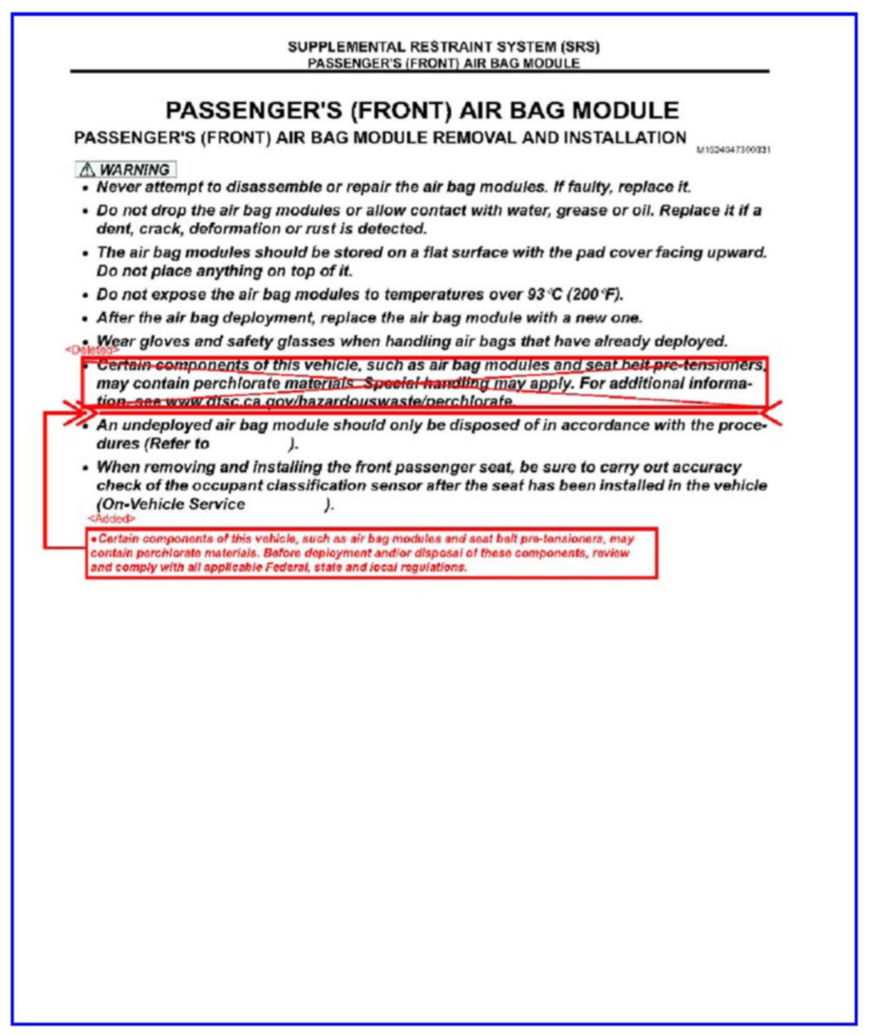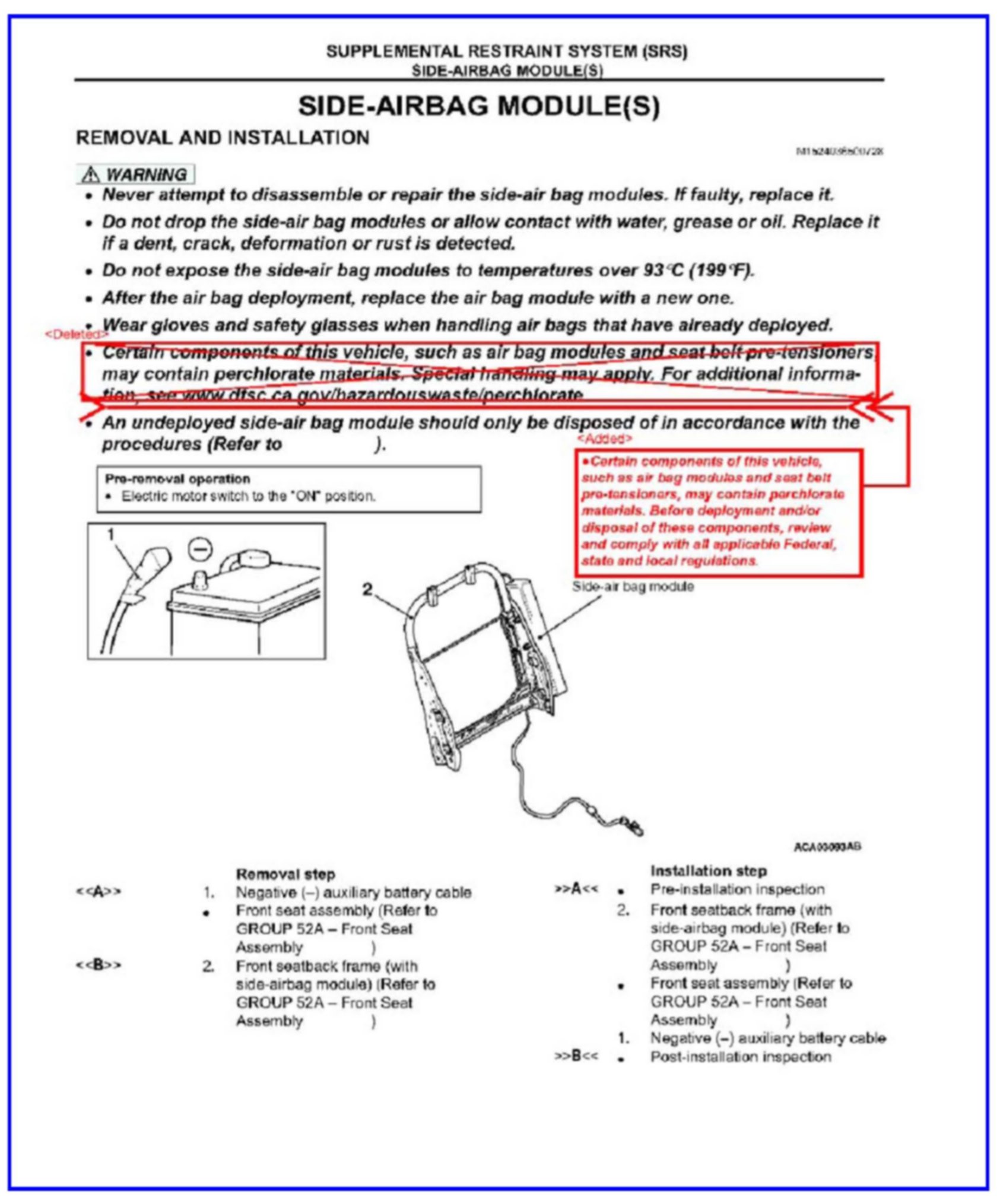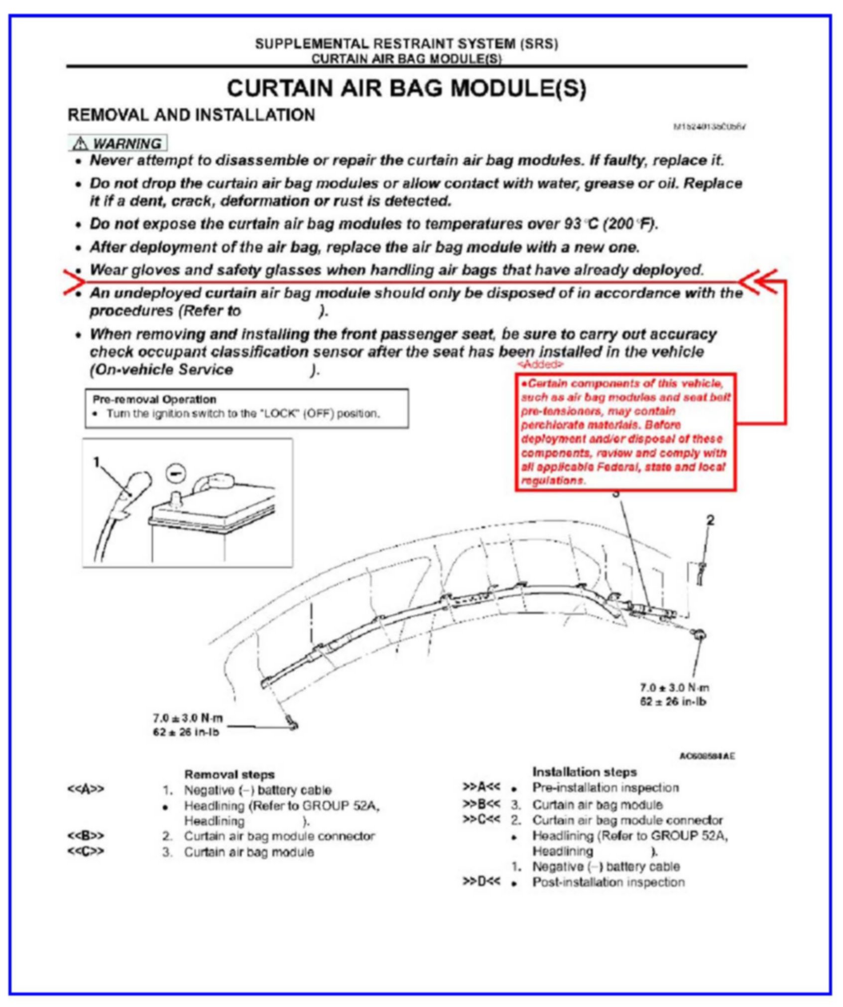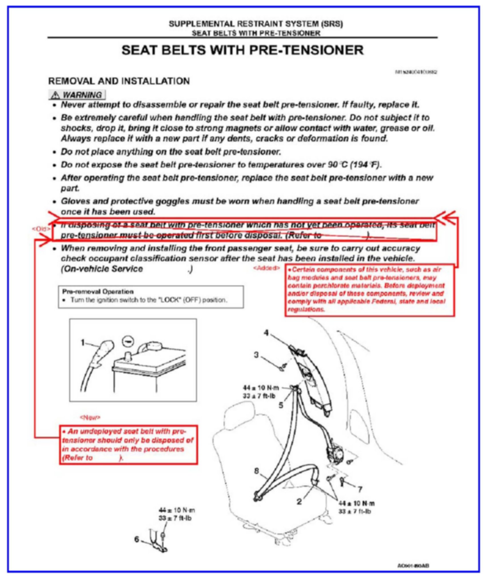 Caution statements regarding the disposal of certain SRS components have been incorrect in the service manuals of affected vehicles. This TSB provides updated caution statements.