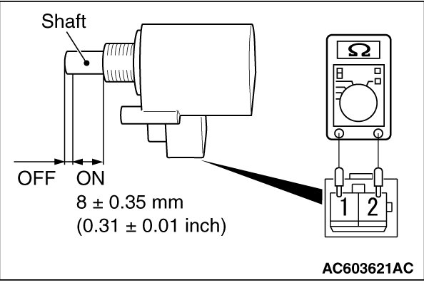2. If continuity exists (2ohms or less) when the shaft is pressed to the value shown in the figure or more, and continuity does not exist when the shaft is released, the clutch interlock switch is in good condition.