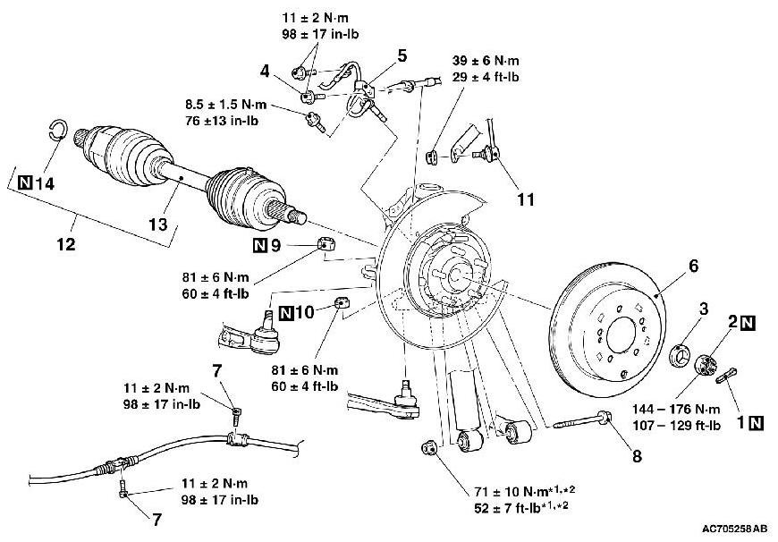 - If, however, the vehicle weight shall be applied to the bearing (in order to move the vehicle), tighten the following special tools MB991000 and MB990998 to the specified torque 144 - 176Nm (107 - 129 ft-lb).
