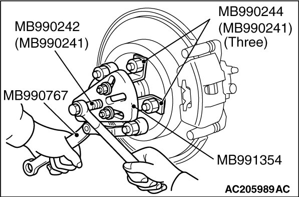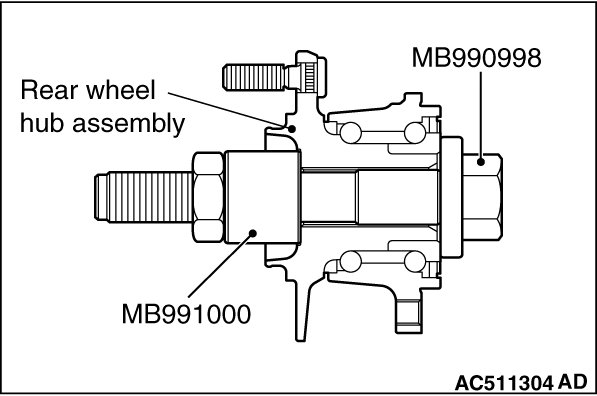 1. If the rear driveshaft assembly is seized with the rear wheel hub assembly, use special tools MB990242 and MB990244, MB990767 and MB991354 to push the rear driveshaft assembly out from the rear wheel hub assembly.