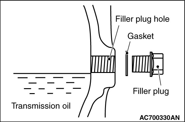 4. Remove the filler plug and gasket, then fill the oil up to the lower edge of the oil filler plug.