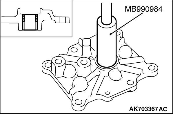 Using special tool, MB990984, install the slide ball bearing in alignment with the control housing end face taking care not to let the bearing protrude to the oil seal installing surface.
