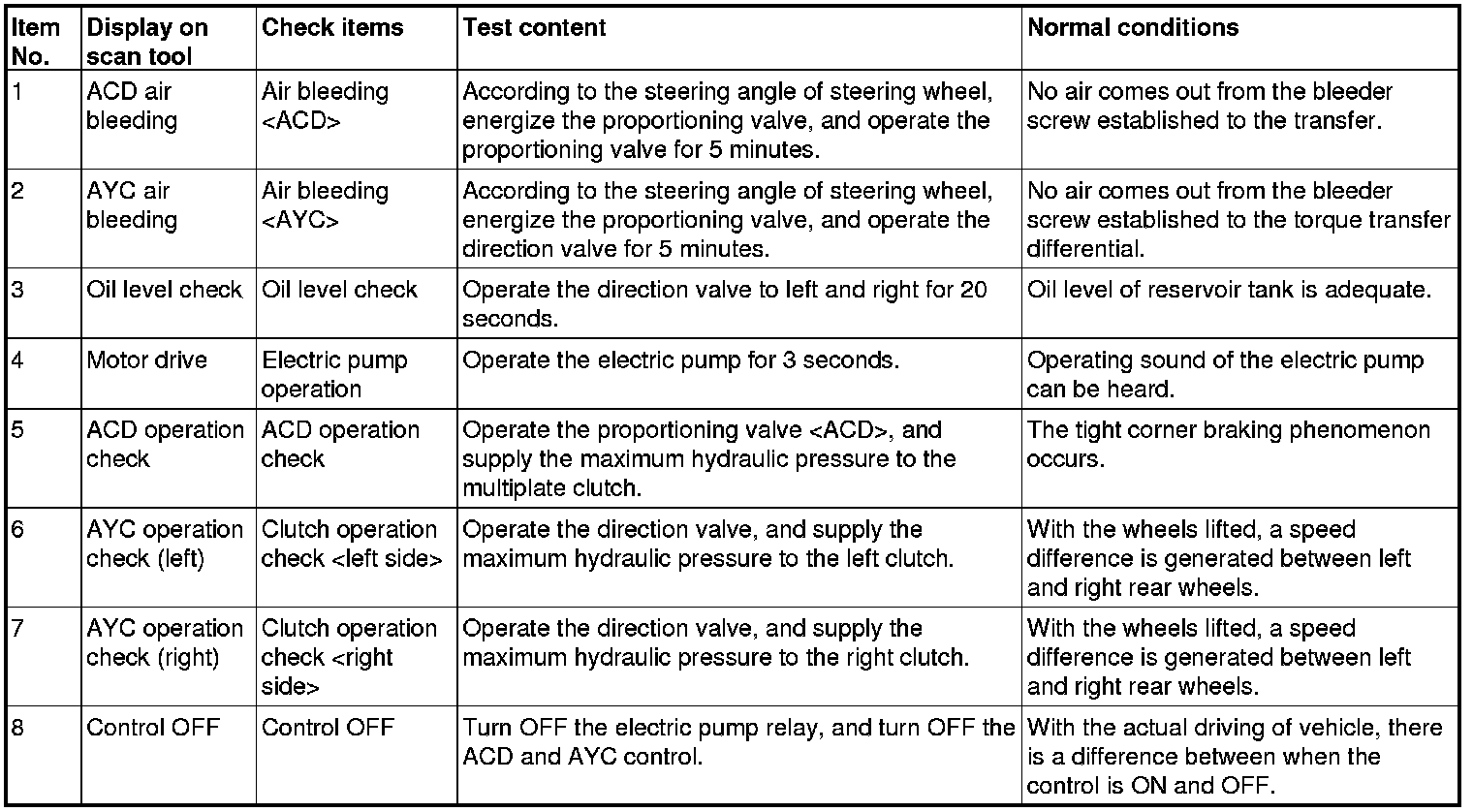 Since the fluid in the hydraulic unit will be hardened under low temperature, all the inspection items in the table may not be checked properly. Therefore, completely remove snow and ice from the hydraulic unit and leave the vehicle under temperature of 0°C (32°F) or higher for 4 hours or more before performing the actuator test.