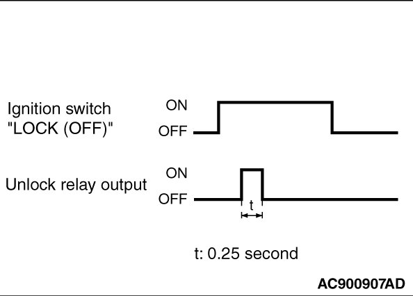 When the ignition switch is turned to the " LOCK (OFF)" position, ETACS-ECU turns the unlock relay output ON for 0.25 second to unlock all the doors.