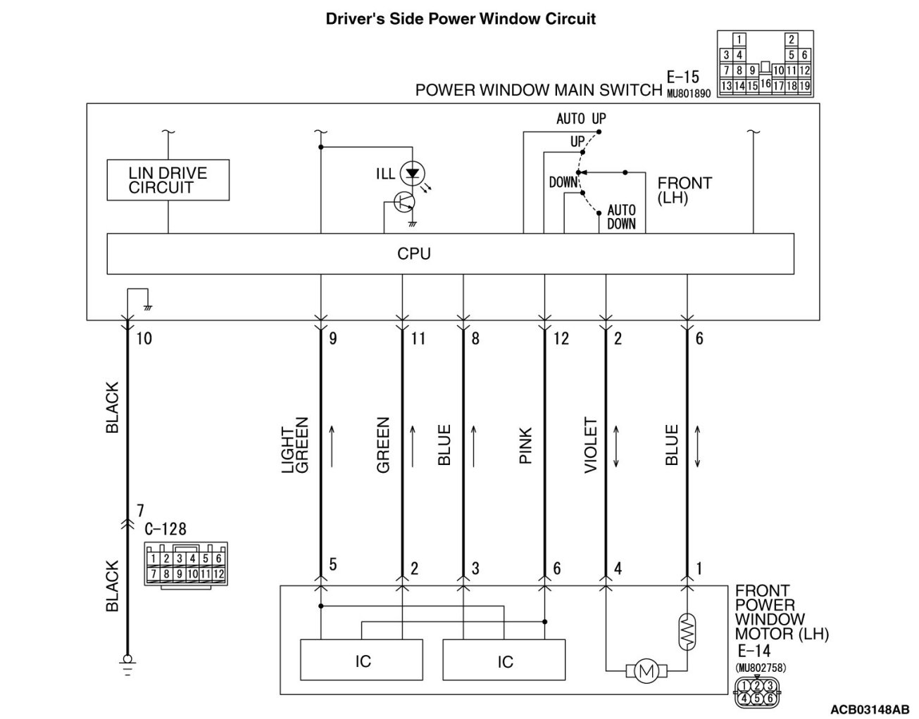 The front power window motor (LH) receives a signal ("UP", "DOWN", "AUTO UP" or "AUTO DOWN") from the front power window main switch and controls the driver's power window.
