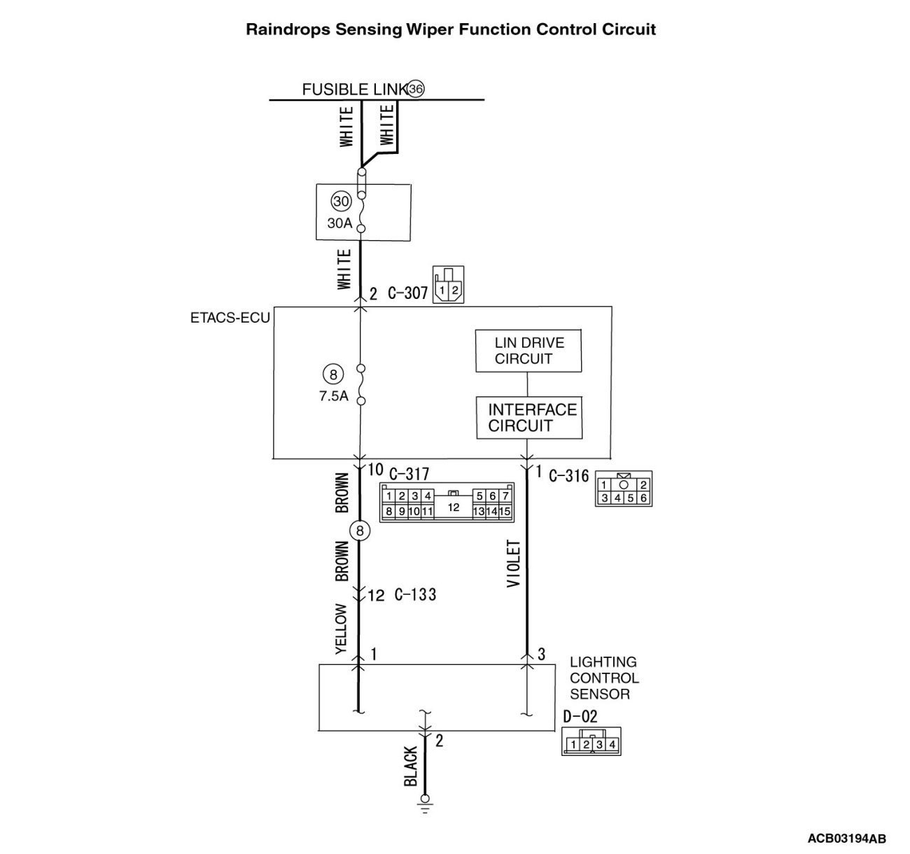 The windshield wiper motor, the column switch, the lighting control sensor, the harness connector, or the ETACS-ECU may be defective.