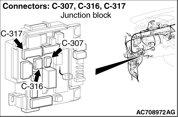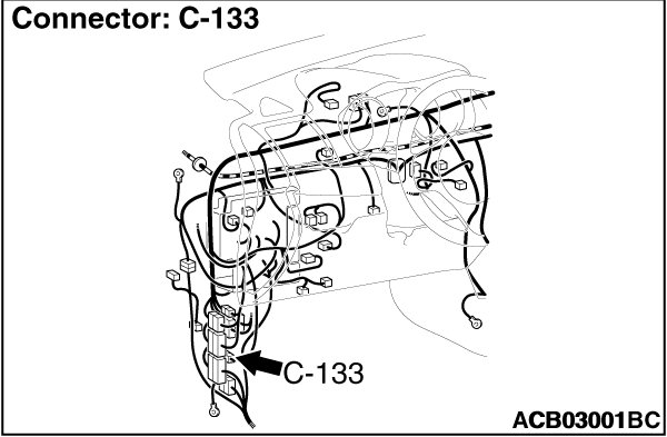 Prior to the wiring harness inspection, check intermediate connector C-133, ETACS-ECU connectors C-307 and C-317, and repair if necessary.