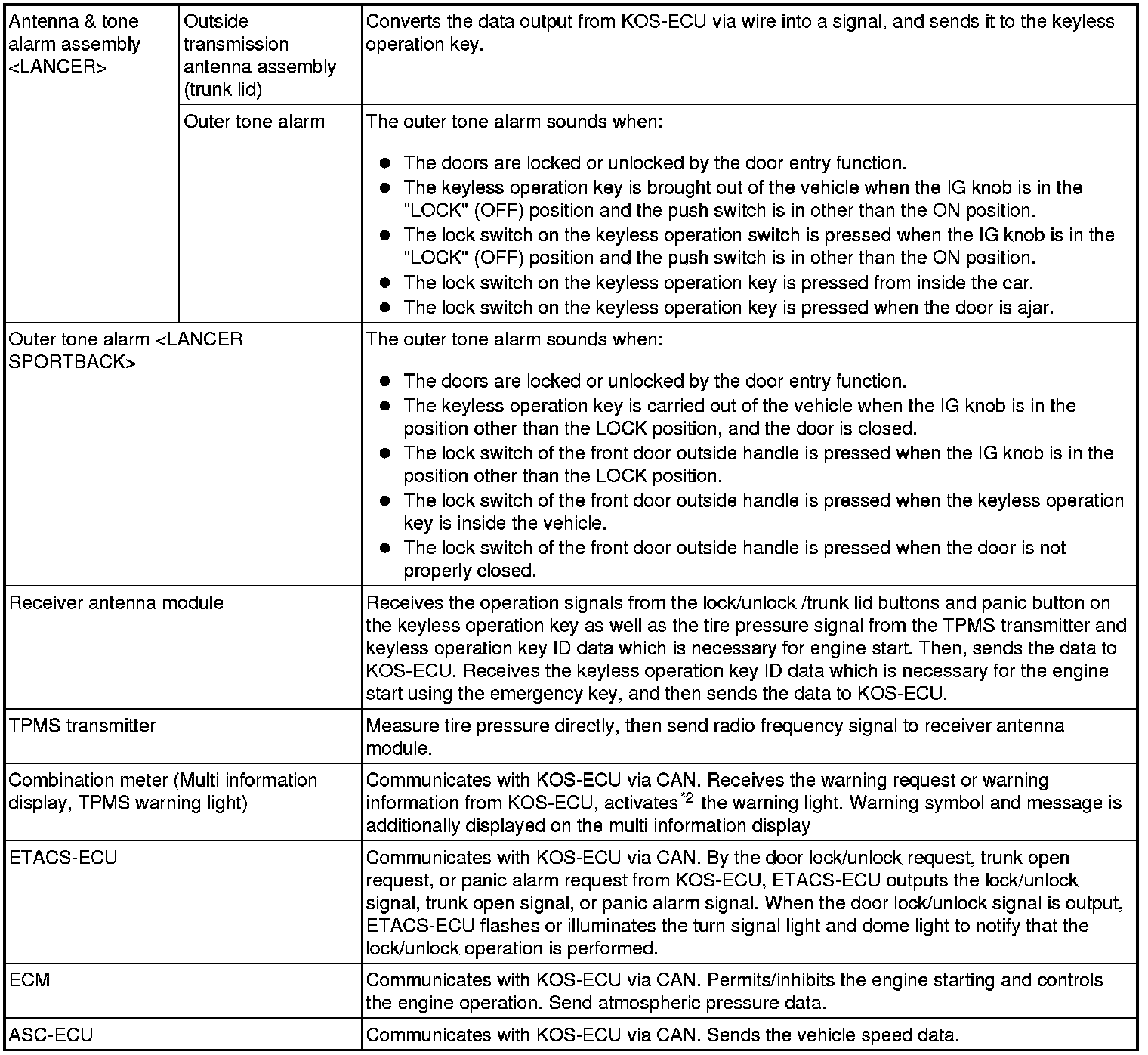 (opening/closing of all doors, opening of trunk lid [LANCER] or liftgate [LANCER SPORTBACK], and operation of warning function that warns a person who intends to damage the vehicle *) by operating the lock/unlock /trunk lid [LANCER] button and panic button on the keyless operation key. The system also incorporates the immobilizer function that prohibits the starting of engine by using an unauthorized key as well as the tire pressure monitoring system (TPMS) that issues a warning to a driver by illuminating or flashing the warning light if an abnormality to the tire pressure or system is detected. KOS has the following features: