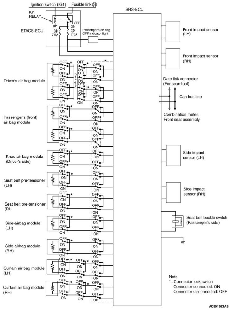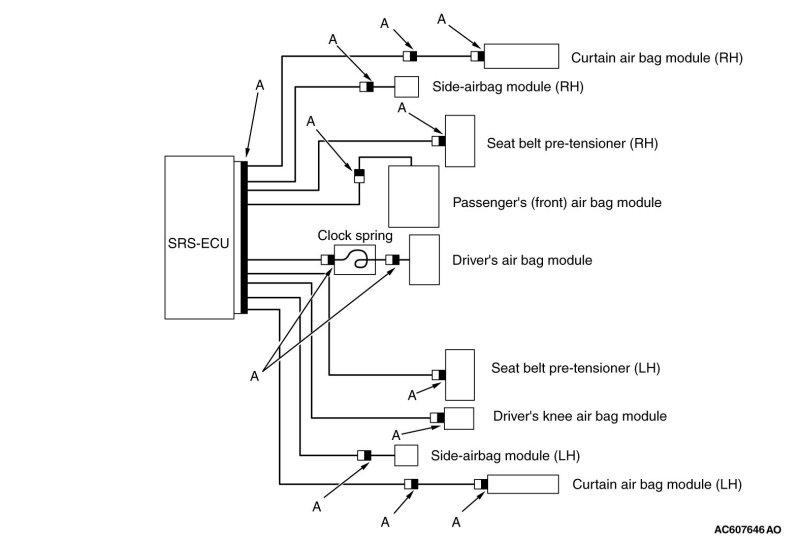 To enhance the system reliability, a connector short circuiting mechanism is integrated in the SRS-ECU connector, air bag module connectors, clock spring connector, pre-tensioner connectors, and intermediate connector between curtain air bag module and SRS-ECU (black connector "A" shown in the figure).