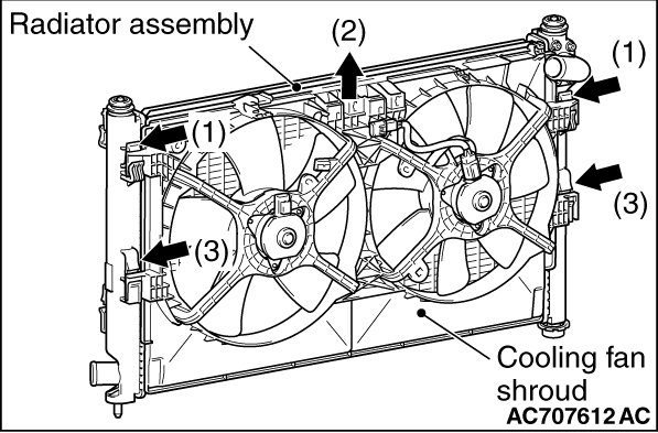 1. Release the upper locks of the radiator assembly from the fan, fan motor and cooling fan shroud assembly.