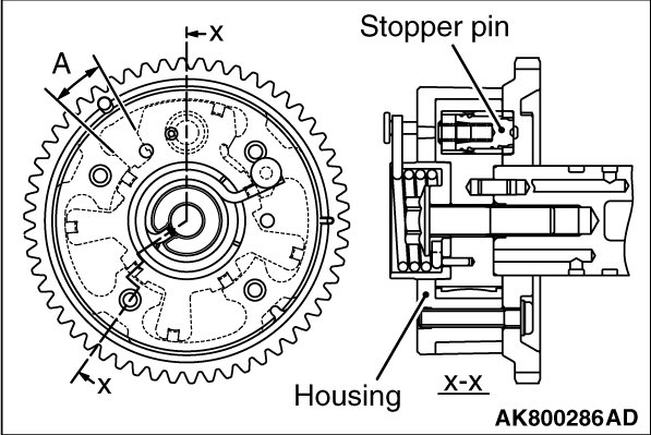 The stopper pin is locked in the most retarded angle position.