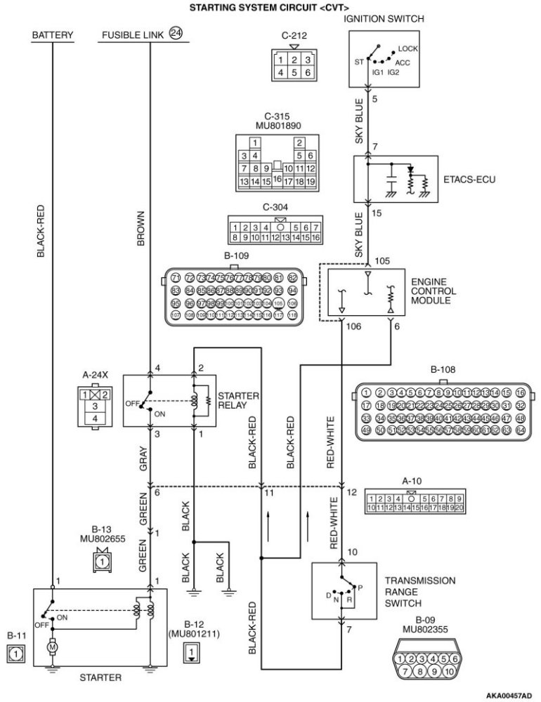 (terminal No. 6) and starter relay connector A-24X (terminal No. 2) because of short circuit to ground. Then confirm that the malfunction symptom is eliminated.