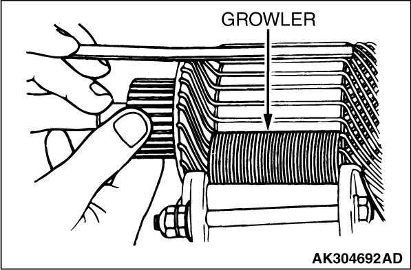 3. Hold a thin steel blade parallel and just above the armature while slowly rotating in the growler. A shorted armature will cause a blade to vibrate and be attracted to the core. Replace the shorted armature.