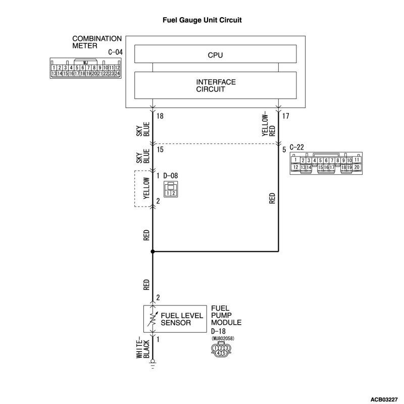 STEP 6. Check the wiring harness between fuel pump module connector D-18 (terminal 2) and combination meter connector C-04 (terminal 17 or 18).