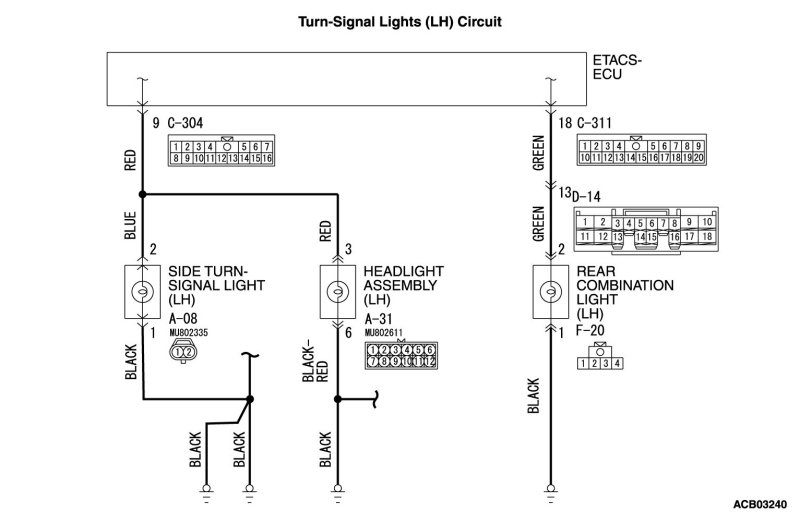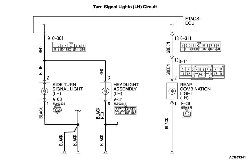 STEP 6. Check the wiring harness between headlight assembly (LH) connector A-31 (terminal 3) [front], side turn-signal light (LH) connector A-08 (terminal 2) [side], rear combination light (LH) connector F-20 (terminal 2) [LANCER (rear)], rear turn-signal light (LH) connector F-39 (terminal 2) [LANCER SPORTBACK (rear)] and ETACS-ECU connector C-304 (terminal 9) [front or side] or C-311 (terminal 18) [rear].