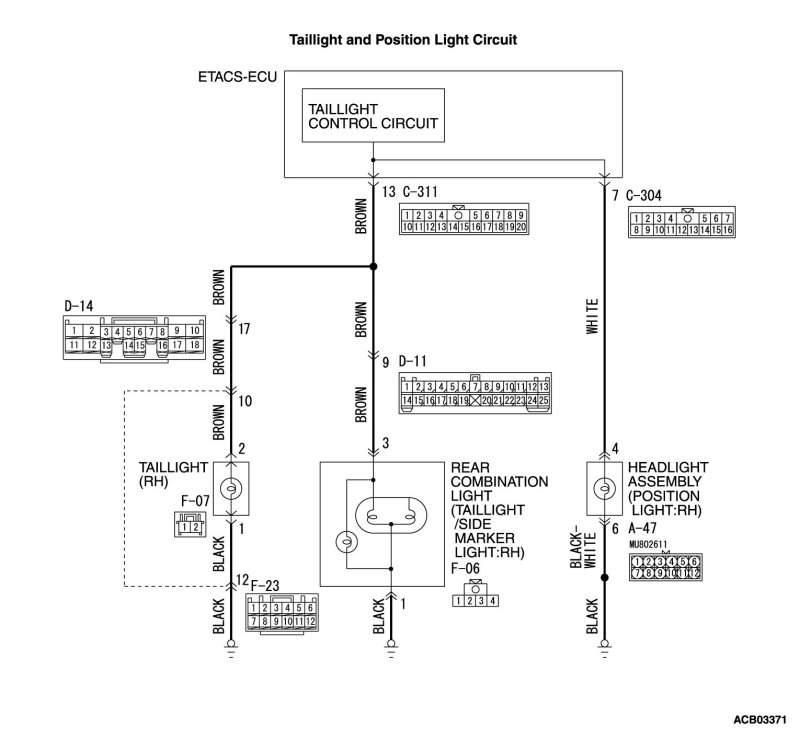 - Check the wiring harness between taillight (RH) connector F-07 (terminal 2) and ETACS-ECU connector C-311 (terminal 13).