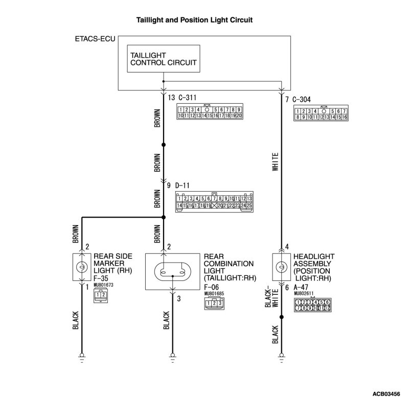 - Check the wiring harness between rear combination light (taillight/side marker light: RH) connector F-06 (terminal 3) and ETACS-ECU connector C-311 (terminal 13).