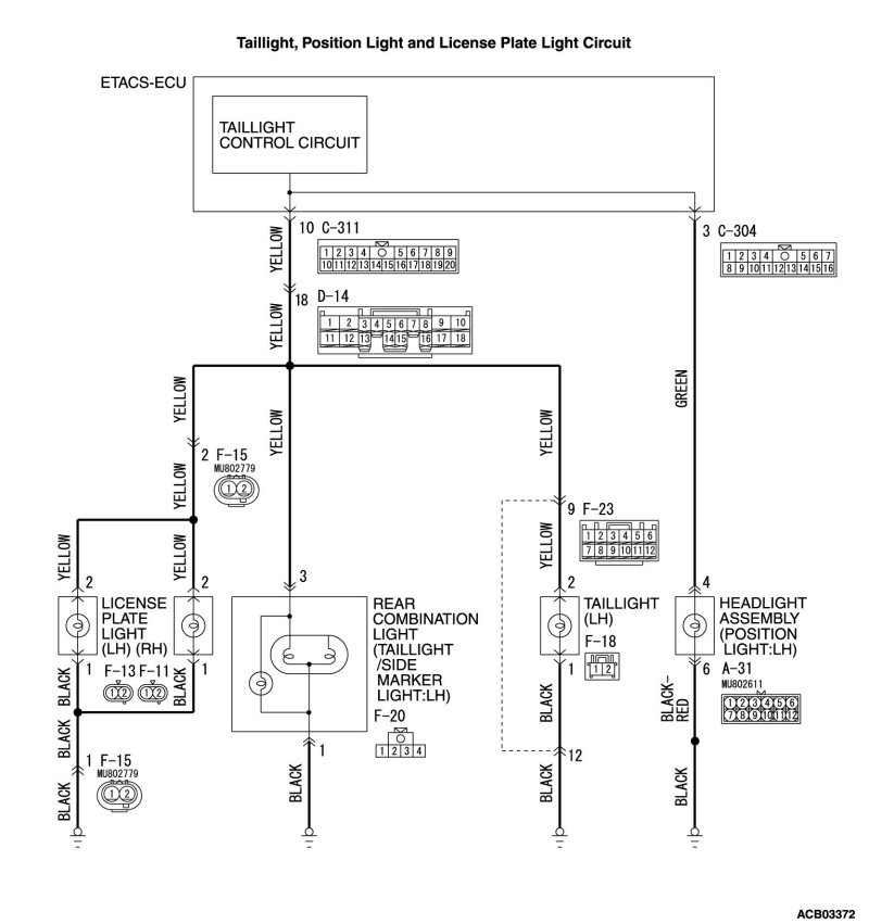 - Check the wiring harness between rear combination light (taillight/side marker light: LH) connector F-20 (terminal 3) and ETACS-ECU connector C-311 (terminal 10).