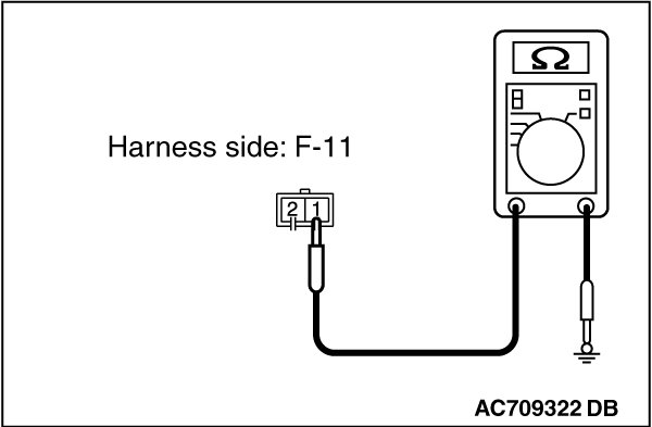 - Measure the resistance between license plate light (RH) connector F-11 (terminal 1) and body ground.