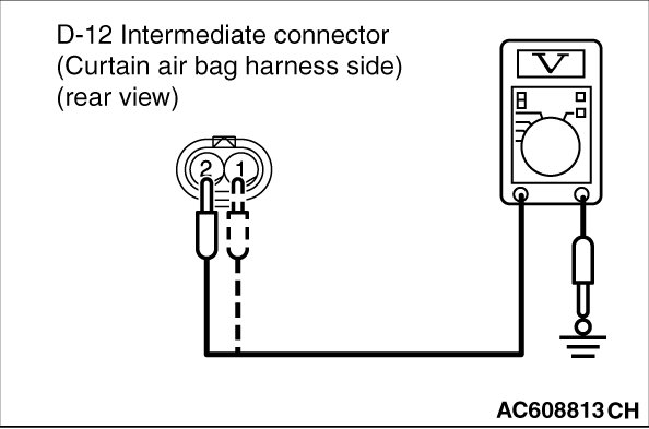 Check for continuity between the D-12 intermediate connector (curtain air bag harness side) terminal No. 1, 2 and the body ground.