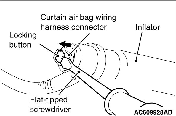 Disconnect curtain air bag module (LH) F-24. Use a flat-tipped screwdriver to unlock the locking button at the harness side connector by withdrawing it toward you in two stages, and then disconnect the connector.