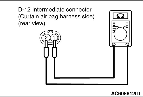 Check for continuity between the D-12 intermediate connector (curtain air bag harness side) terminal No.1 and 2.
