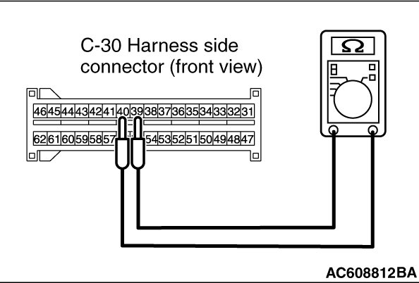 (5)Check for continuity between the C-30 wiring harness side connector terminal No. 39 and No. 40.