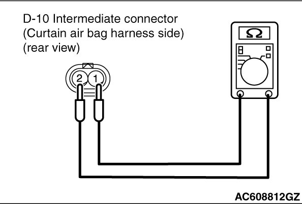 Check for continuity between the D-10 intermediate connector (curtain air bag harness side) terminal No.1 and 2.