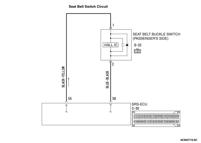 - SRS-ECU connector C-30 (terminal No.58) and the seat belt buckle switch (passenger's side) connector D-33 (terminal No.2)