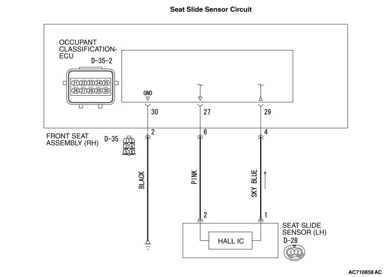 - Occupant classification-ECU connector D-35-2 (terminal No.27) and the seat slide sensor connector D-28 (terminal No.2)