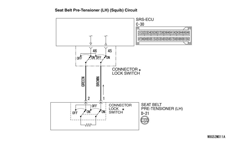 *: The squib circuit connectors integrate a "short" spring (which prevents the seat belt pre-tensioner from deploying unintentionally due to static electricity by shorting the positive wire to the ground wire in the squib circuit when the connectors are disconnected)