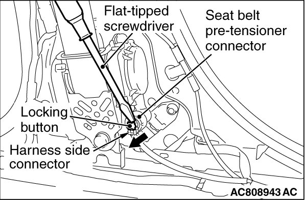 Disconnect driver's seat belt pre-tensioner connector D-21. Use a flat-tipped screwdriver to unlock the locking button at the harness side connector by withdrawing it toward you in two stages, and then disconnect the connector.