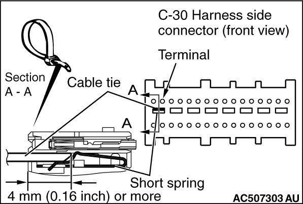 Insert a cable tie [3 mm (0.12 inch) wide, 0.5 mm (0.02 inch) thick] between terminals 45, 46 and the short spring to release the short spring.