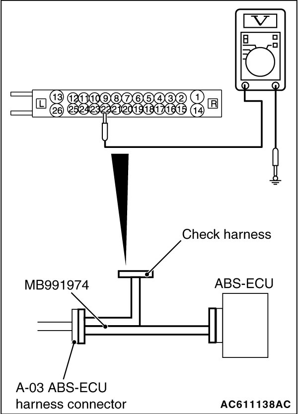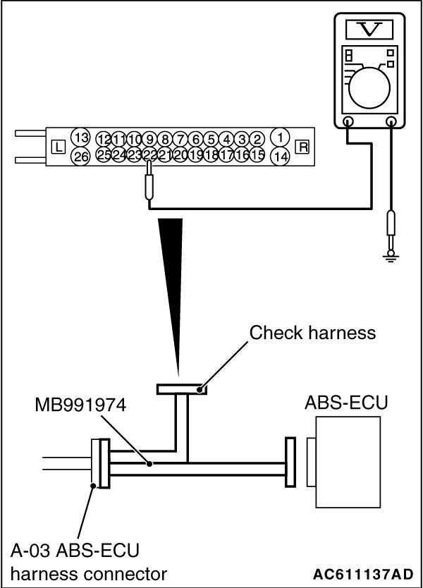 (1)Disconnect the ABS-ECU connector, connect special tool ABS check harness (MB991974) to the harness-side connector, and then measure the voltage at the special tool connector side.