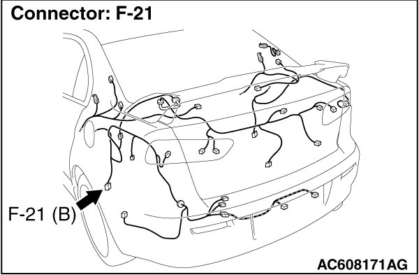 STEP 5. Wiring harness check between A-03 ABS-ECU connector terminal No.24 and F-21 rear wheel speed sensor (LH) connector terminal No.1, and between A-03 ABS-ECU connector terminal No.25 and F-21 rear wheel speed sensor (LH) connector terminal No.2.