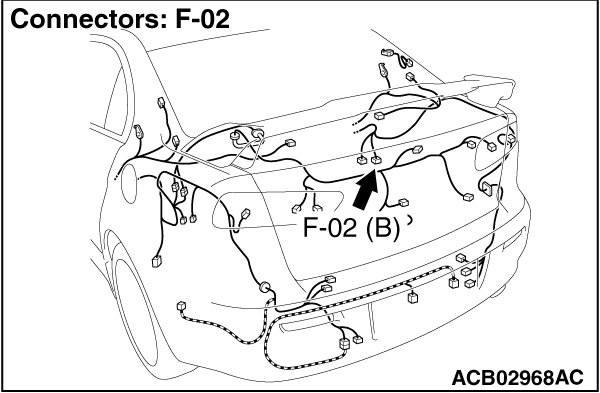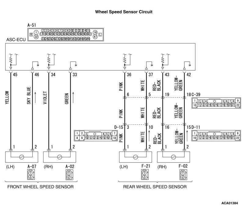 STEP 6. Wiring harness check between A-51 ASC-ECU connector terminal No.43 and F-02 rear wheel speed sensor [RH] connector terminal No.1, and between A-51 ASC-ECU connector terminal No.42 and F-02 rear wheel speed sensor [RH] connector terminal No.2.