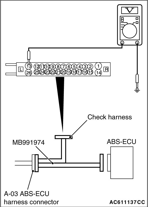 (1)Disconnect the ABS-ECU connector, connect special tool ABS check harness (MB991974) to the harness-side connector, and measure the voltage at the special tool connector side.