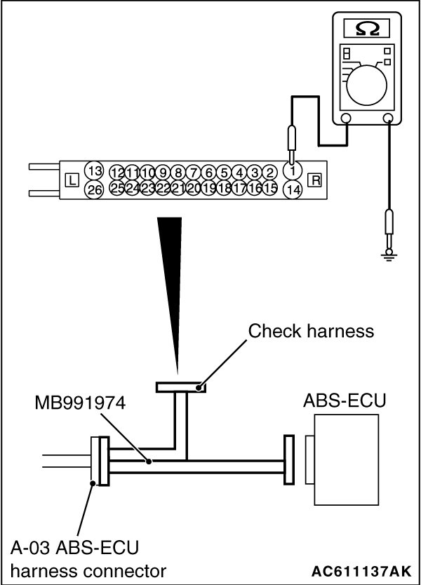 (1)Disconnect the ABS-ECU connector, connect special tool ABS check harness (MB991974) to the harness-side connector, and then measure the resistance at the special tool connector side.