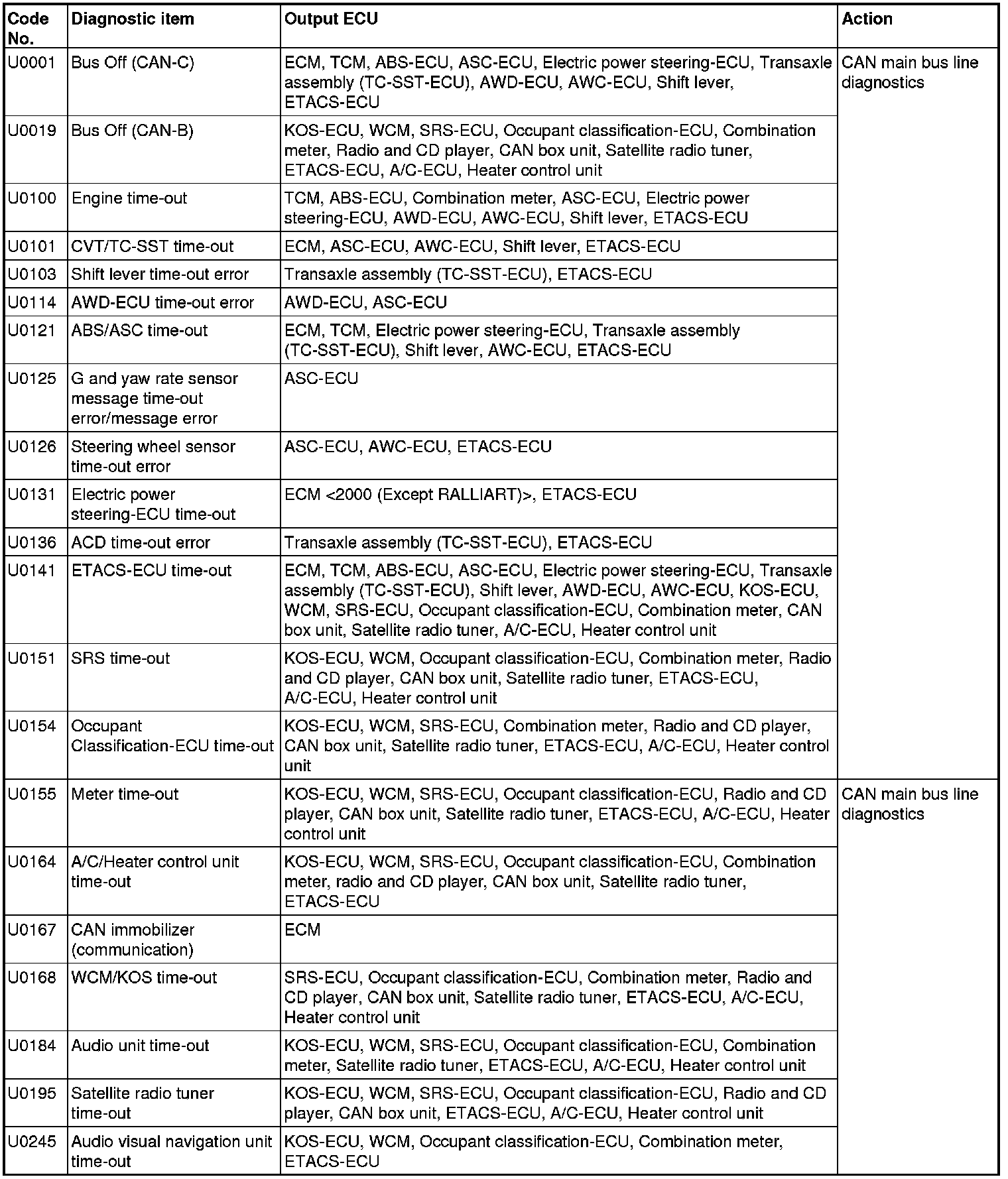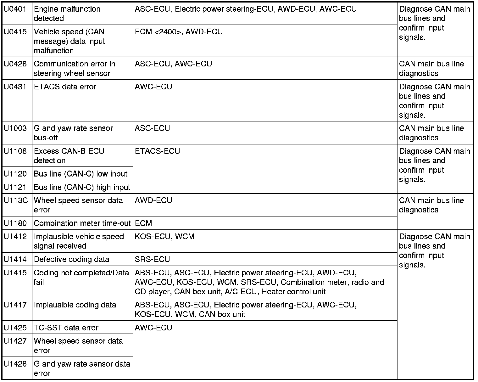 CAN COMMUNICATION-RELATED DTC (U-CODE) TABLE