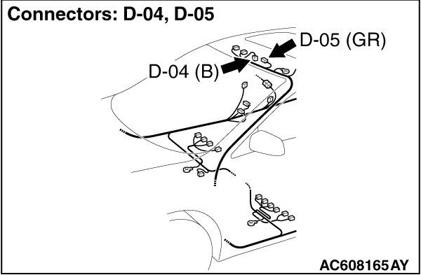 STEP 1. Check sunroof switch connector D-04 and sunroof motor assembly D-05 for loose, corroded or damaged terminals, or terminals pushed back in the connector.
