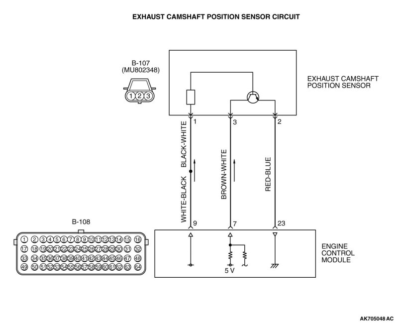 - Terminal No. 2 of the exhaust camshaft position sensor is grounded with ECM (terminal No. 23).