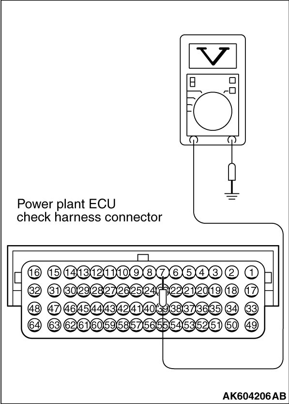 When checking with the ECM side connector, disconnect all ECM connectors. Connect the power plant ECU check harness special tool MB992110 between the separated connectors. Then connect the oscilloscope probe to the check harness connector terminal No. 7.