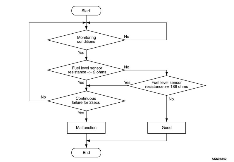 - Fuel level sensor resistance is more than 186 ohms for 2 seconds.