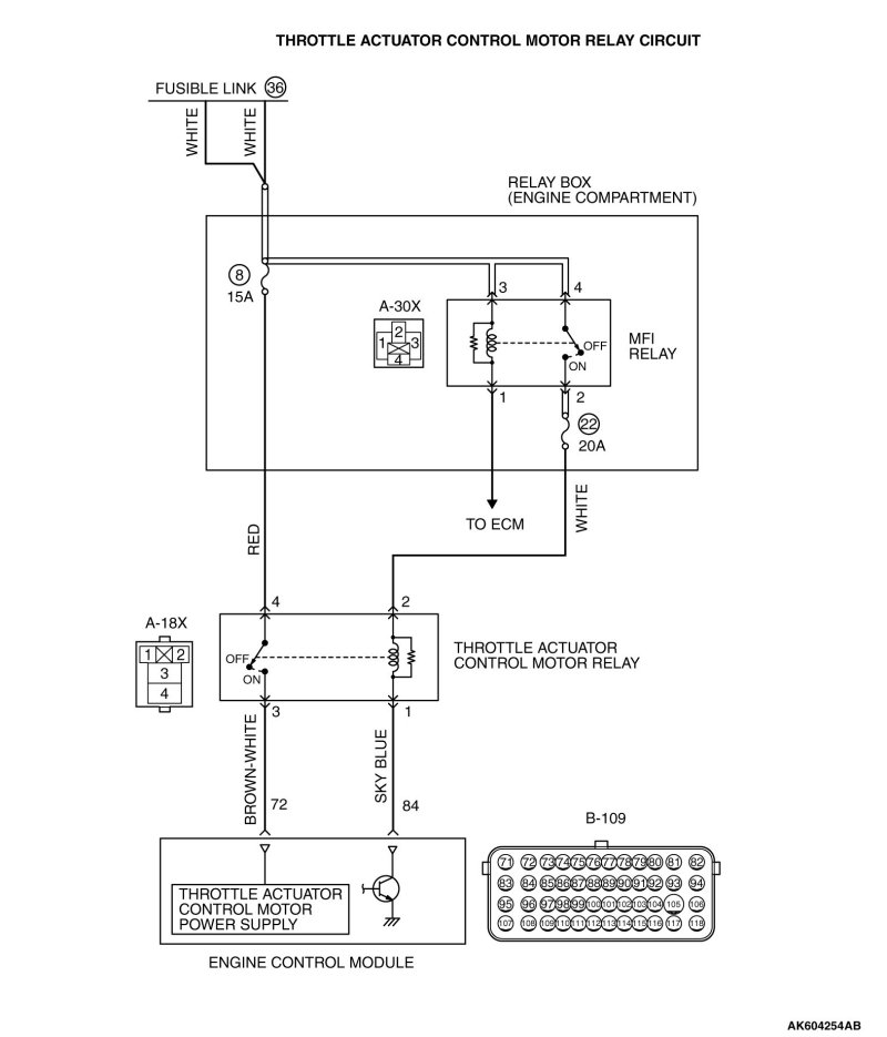 - When the throttle actuator control motor relay turns ON, battery positive voltage is supplied by the throttle actuator control motor relay (terminal No. 3) to the ECM (terminal No. 72).