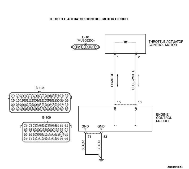 STEP 6. Check for open circuit and harness damage between electronic-controlled throttle valve connector B-10 (terminal No. 1) and ECM connector B-108 (terminal No. 15).