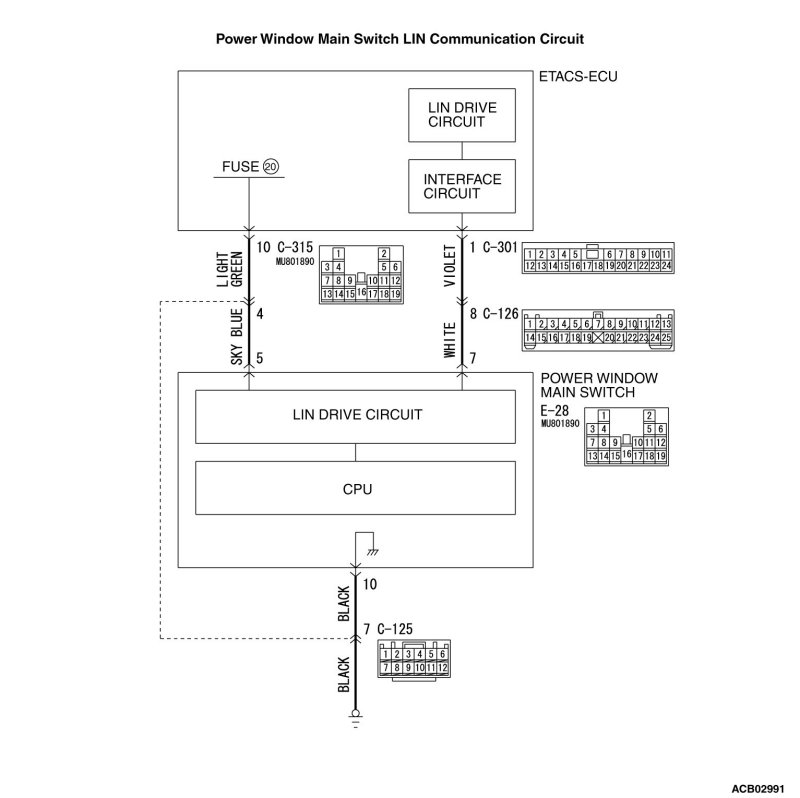 - Connector(s) or wiring harness in the LIN bus lines between the power window main switch and the ETACS-ECU, the power supply system of the power window main switch, or the power window main switch itself may be defective.