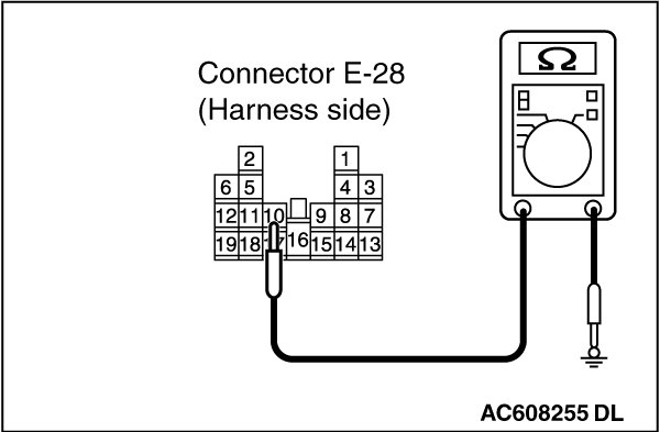 (2)Measure the resistance value between power window main switch connector E-28 terminal 10 and ground.