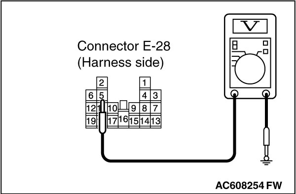 (2)Measure the voltage between power window main switch connector E-28 terminal 5 and ground.
