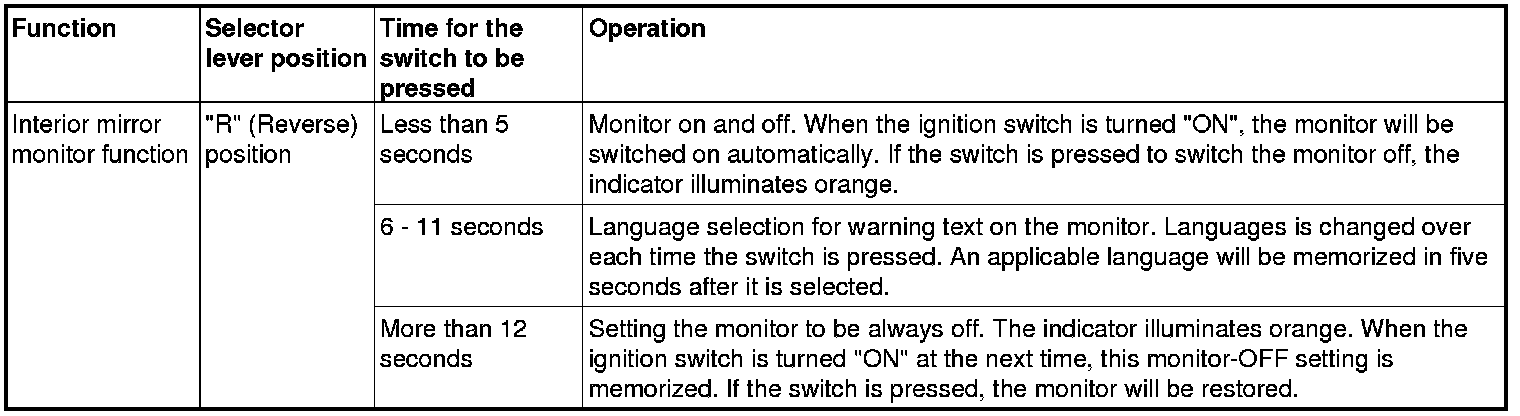 - The indicator illuminates green when the rear view monitor (integrated in interior mirror) displays the rear view.