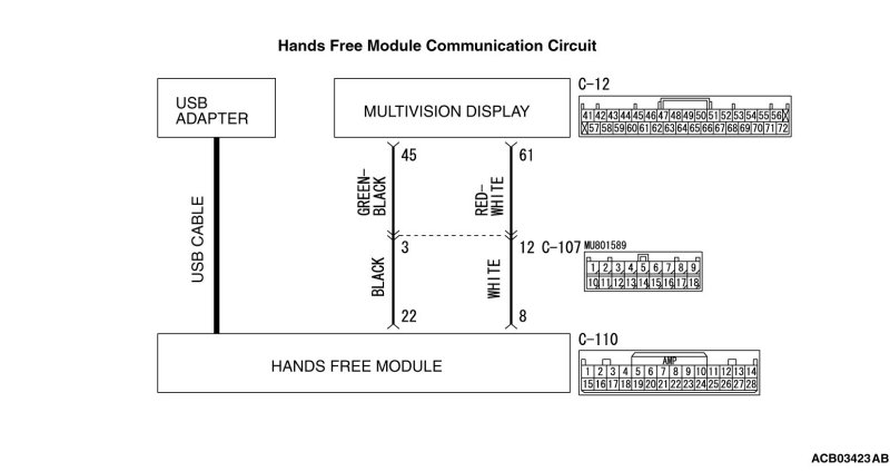 STEP 6. Check the wiring harness between hands free module connector C-110 (terminal 22, 8) and multivision display connector C-12 (terminal 45, 61).